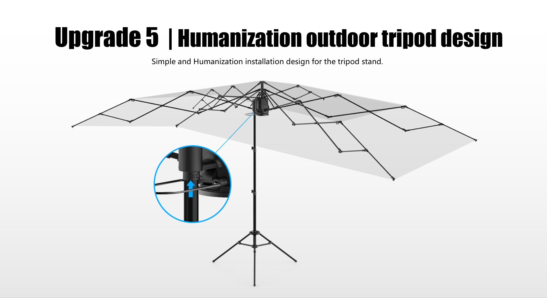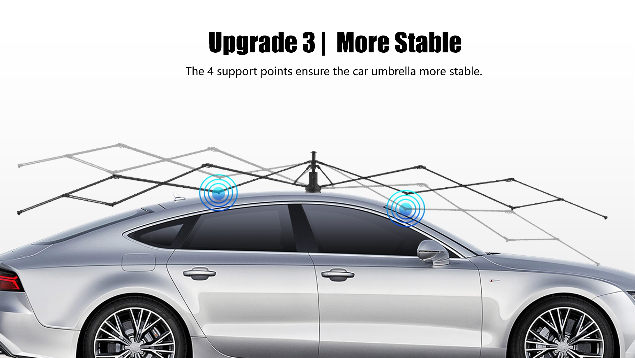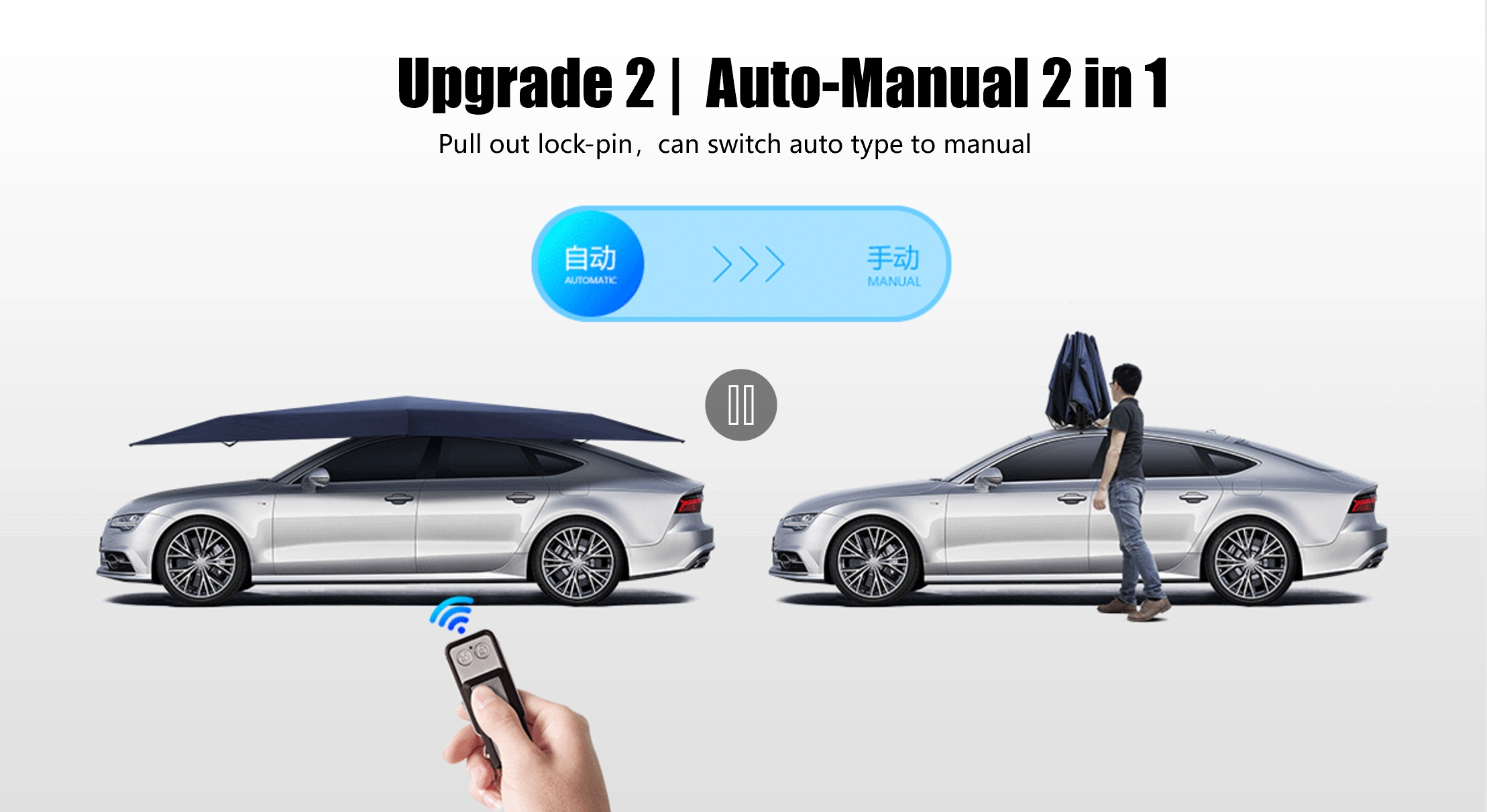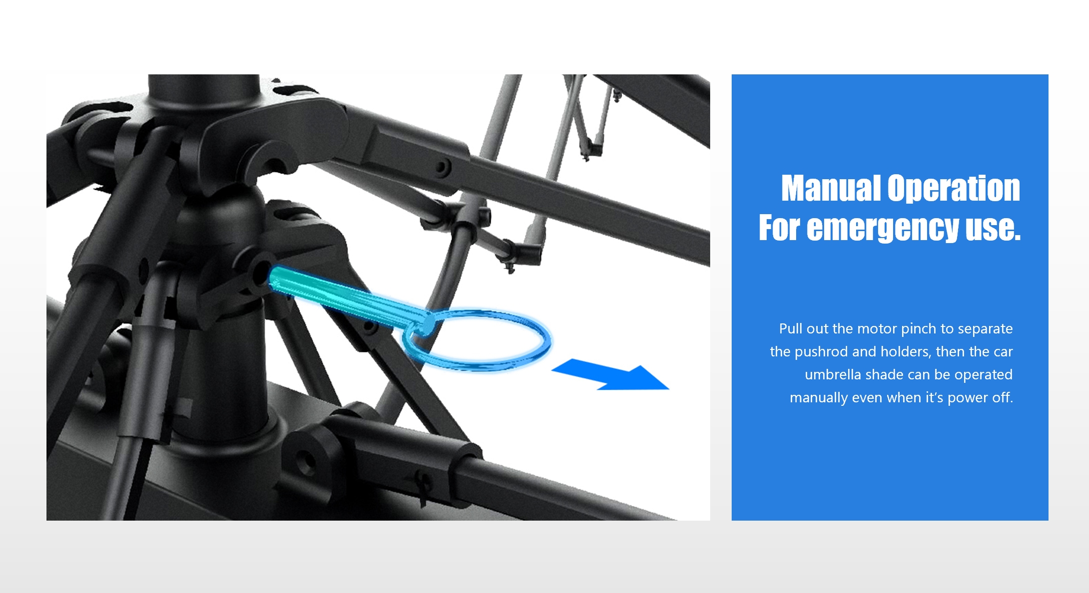 Naast het automatisch omhoog en omlaag gaan via de afstandsbediening, kan er op elk moment naar de handmatige modus worden geschakeld, afhankelijk van uw voorkeuren. De geoptimaliseerde motor verbruikt minder energie en is batterijvriendelijker. De speciaal ontworpen statiefstructuur voor buiten zorgt voor een stabielere installatie en maakt een snelle opstelling buiten het voertuig mogelijk, waardoor het creëren van een tijdelijk zonnescherm voor kampeertochten wordt vergemakkelijkt.