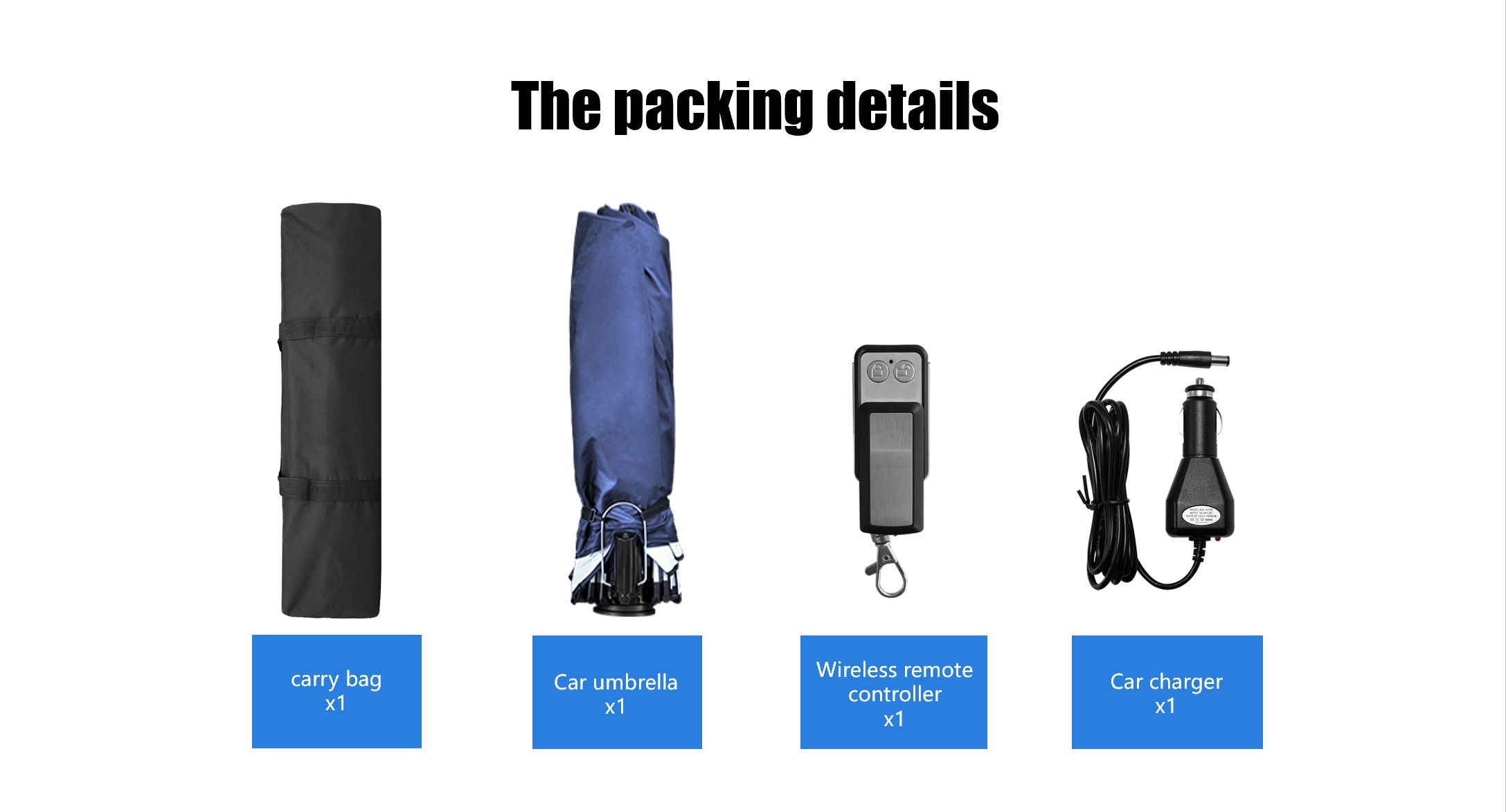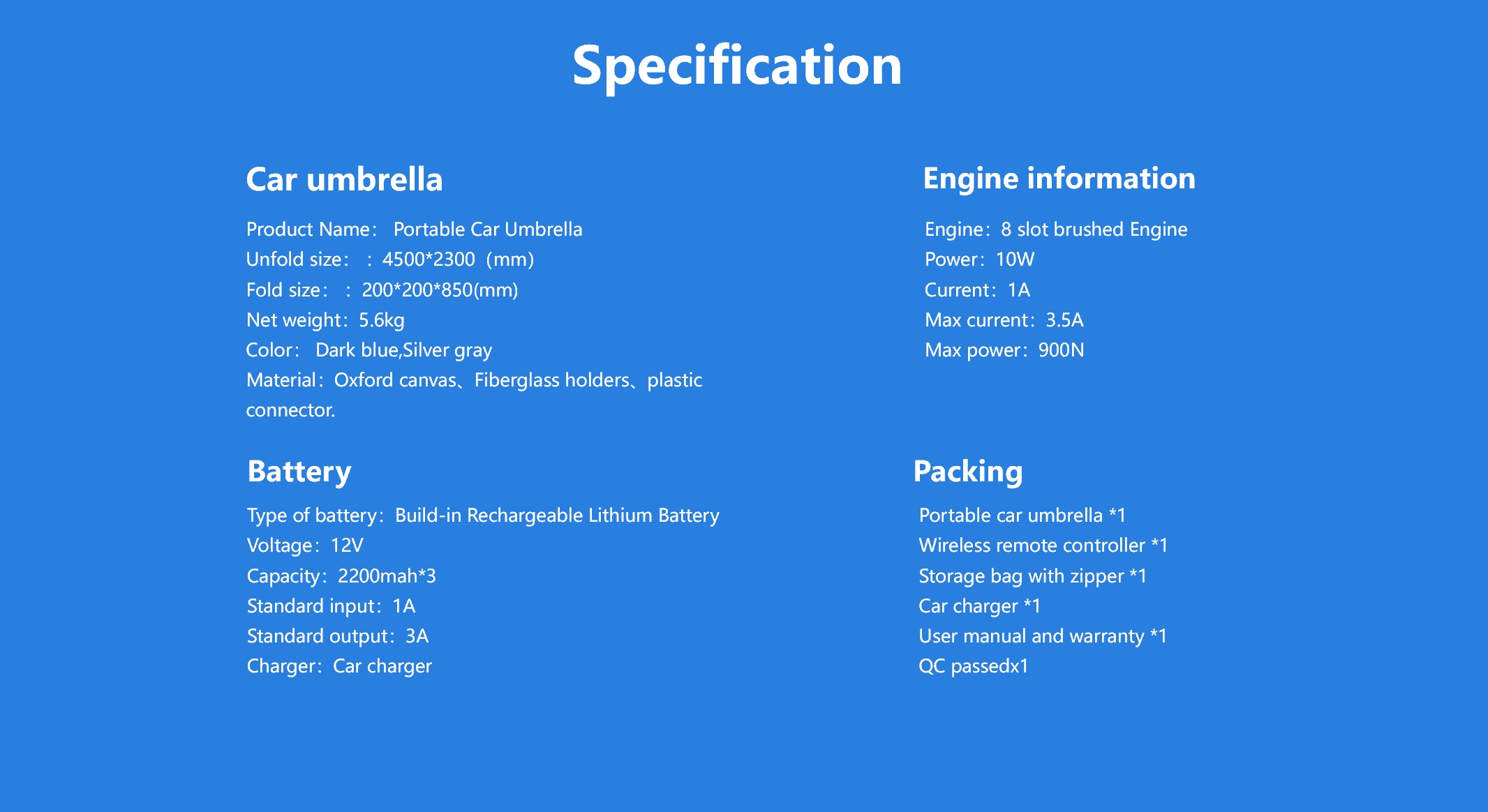 | Accessoires | Draagbare autoparaplu x 1, Opbergtas met ritssluiting x1, Gebruikershandleiding en garantiekaart x1. |