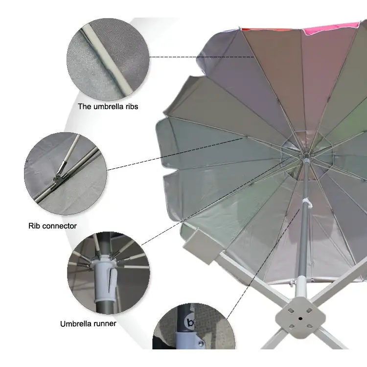 Strandparasol om direct zonlicht op het strand in de grote parasol te voorkomen. Het strandparaplu-ontwerp is gebaseerd op de parasol en de evolutie. Maar nu met de ontwikkeling van een minimalistische stijl en commerciële vrijetijdsindustrie, wordt deze op grote schaal gebruikt voor strandparasols op het strand, mooie vorm, effectief zonweringeffect, goedkope commerciële buitenreclame is meer bevorderlijk voor de promotie van zijn tijd. De parasol is gemakkelijk te verplaatsen, eenvoudige installatie, lage kosten en voordelen voor logo-aankondiging.