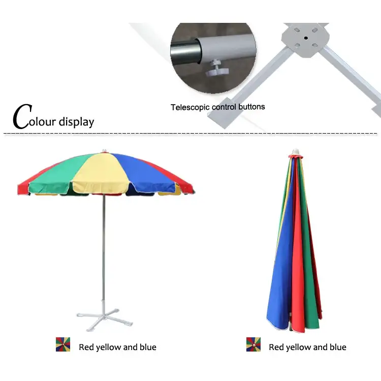 Strandparasol om direct zonlicht op het strand in de grote parasol te voorkomen. Het strandparaplu-ontwerp is gebaseerd op de parasol en de evolutie. Maar nu met de ontwikkeling van een minimalistische stijl en commerciële vrijetijdsindustrie, wordt deze op grote schaal gebruikt voor strandparasols op het strand, mooie vorm, effectief zonweringeffect, goedkope commerciële buitenreclame is meer bevorderlijk voor de promotie van zijn tijd. De parasol is gemakkelijk te verplaatsen, eenvoudige installatie, lage kosten en voordelen voor logo-aankondiging.